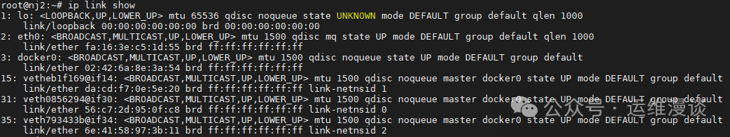 3: docker0: <BROADCAST,MULTICAST,UP,LOWER_UP> mtu 1500 qdisc noqueue state UP mode DEFAULT group default