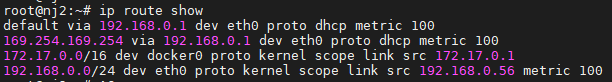 192.168.0.0/24 dev eth0 proto kernel scope link src 192.168.0.56 metric 100