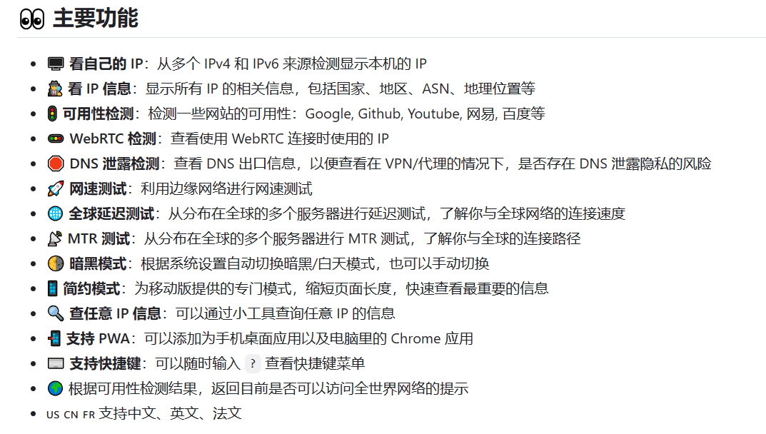 MyIP 是一个简单而实用的开源 IP 信息查看器,可以查看IP、网络连通性、检查 WebRTC 连接、检查 DNS 泄露、网速测试、MTR测试等等。