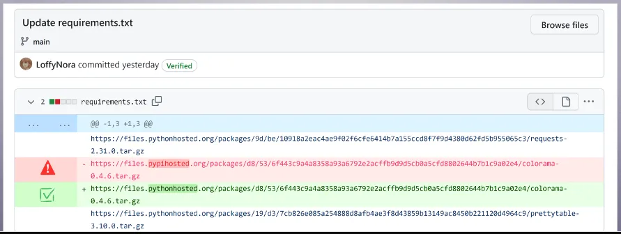 Checkmarx强调了一个3月份的案例,攻击者黑入了 “editor-syntax” 的账户,这是一个在top.gg平台上具有重大写入权限的维护者账户。通过这个账户,攻击者能够修改top.gg在GitHub上的仓库,对python-sdk仓库进行恶意提交, 通过修改”requirements.txt”(pypi包管理器的特征文件)文件, 将代理仓库的地址修改为攻击者建立的伪造站点, 一旦恶意 Python 代码被执行便会自动向伪造站点下载恶意软件包。