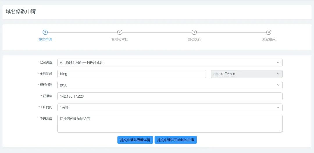 当然对于一些测试之类非核心域名也支持跳过审批自动处理,或者是根据具体的动作来选择跳过审批过程,例如默认新建域名无需审批,这个要根据具体的域名来配置了,充分考虑安全性和灵活性