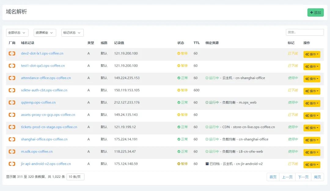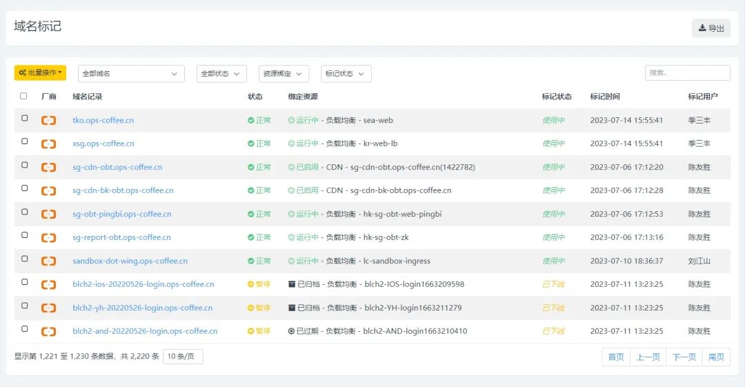 前文多次提到标记和盘点,所谓盘点就是对我们所有使用的域名做一次全面的梳理,确定哪些域名记录有在使用,而哪些域名记录已经不用了,这里通过系统判断加人工确认的方式来实现,例如之前说的,如果域名解析没有绑定资源或是域名绑定资源已过期,那多半域名解析已经不在使用了,这时候可以标记域名解析状态为已下线,等待后续确认删除
