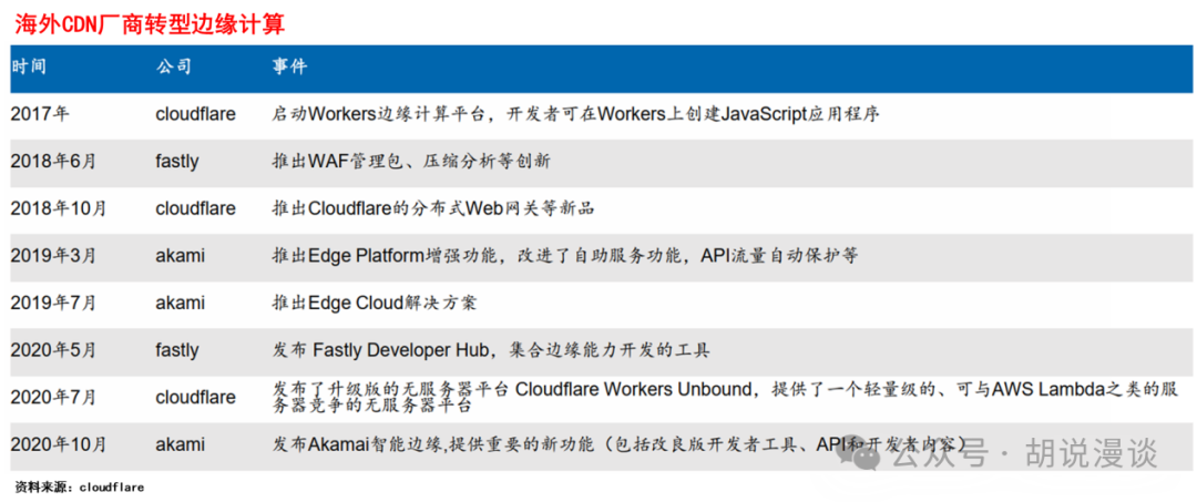 2017年以来,海外CDN厂商在边缘计算和边缘AI领域陆续展开布局,如Cloudflare提供开发者平台workers,Fastly使用边缘云来运行人工智能推理等。