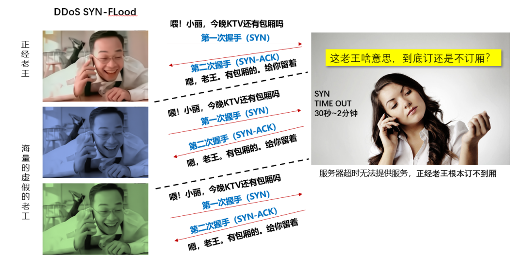 就好比一个著名的“某红书”打卡餐厅,平时生意非常的火爆,这种引起来的隔壁老王的忌妒。这时老王就想了个损招,去网上找了大量的来自五湖四海甚至世界各国的街溜子去这个餐厅排队或打电话,每个人不点餐只是问收银员或服务员这里有什么特色菜啊,口味如何价钱怎么样啊……。这样就导致了餐厅所有的服务员和收银员只能忙于应付这些街溜子的无穷无尽的询问,从而无法给正常的食客提供服务了。