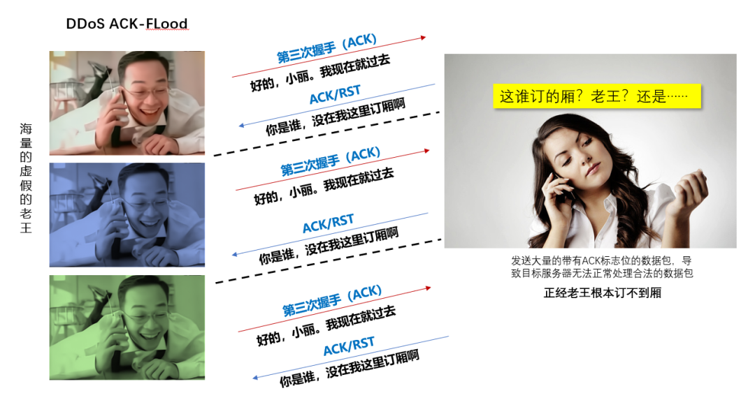 ACK Flood攻击:攻击者发送大量ACK请求,但不进行第一次握手(SYN)。这使得服务器在收到ACK请求时,无法找到匹配的SYN请求,从而消耗服务器的处理资源。服务器在收到大量无用的ACK数据包时,无法正常响应其他请求。