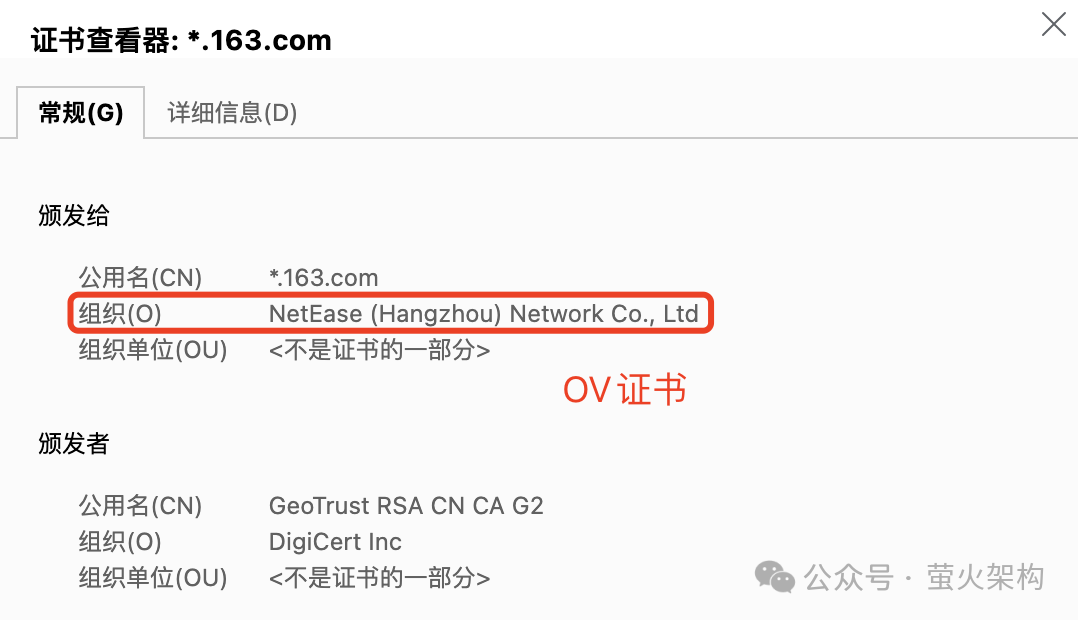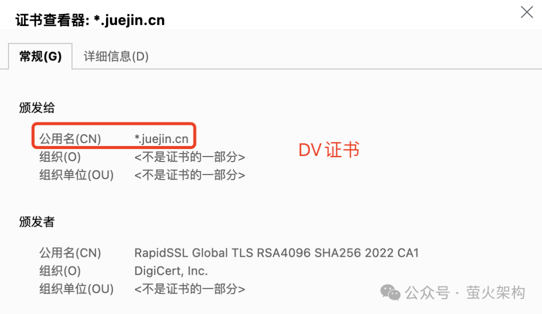 这种证书只验证网站拥有者对域名的控制权。CA会通过Url文件验证或DNS记录验证等方式来确认申请者是否控制该域名。DV证书的发放速度快,成本低,但它只证明域名的控制权,不会验证组织的真实身份。