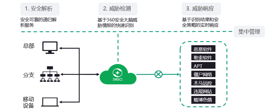 安全DNS以安全、高速、稳定的360公共DNS服务为基础,以DNS解析数据、360独家威胁情报、未知威胁检测模型和AI引擎为核心,以较低的采购和部署成本,为客户提供有效的网络威胁检测、威胁响应和上网行为管理功能。