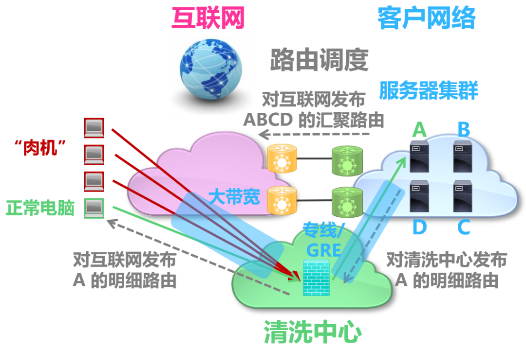 通过上述三步操作,由于明细路由的优先级高于汇聚路由,这样从互联网访问服务器 A 的流量就被先“引导”到了清洗中心,清洗后再的干净流量再被重新“注入”回客户网络并到达服务器 A。由于上述过程中,服务器 A 无法“感知”到清洗中心的存在,因此,也被称作透明模式。