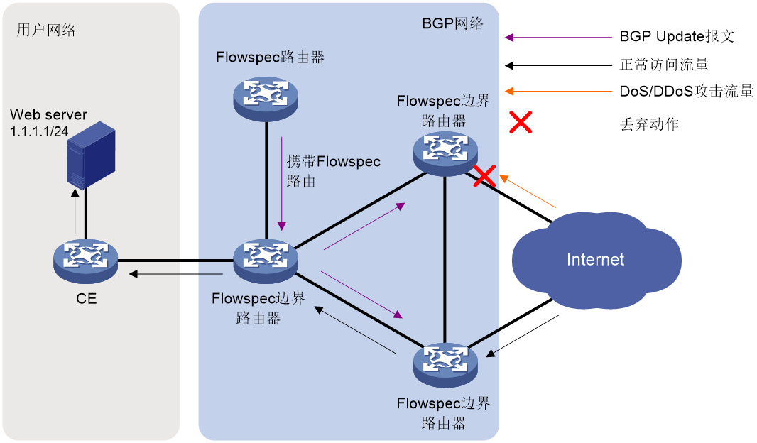简而言之,Flowspec 流控就是根据攻击流量的特性,预先在网络边缘或枢纽节点做一些流量控制的配置,例如对攻击流量进行丢弃或限速,主要针对流量特征比较显著的大流量攻击。