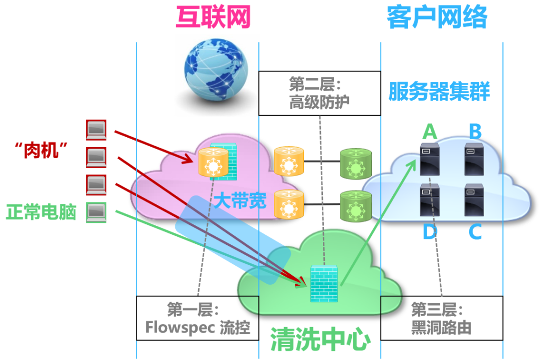 基于 DDoS 的攻击的三个特点,在实践中,往往会采取分层防御的机制,根据各类攻击流量的不同特点,在流量传输的不同阶段,采取不同的防御手段分别进行处理,分而治之。这样一些攻击流量将较早地被处理,避免所有的攻击压力直接传递到客户网络中。