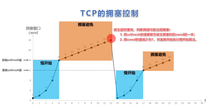 拥塞控制主要用来避免包丢失和超时重传,如果出现了这两种现象,就说明发的速率太快了。那最开始怎么知道发送速率呢?其实开始时只发送一个报文段数据,如果收到一个确认,则倍增报文段,依次类推。当发现超时重传时,就又回到只发送一个报文段的情况,这个就是慢启动,这种方式不合适。其实还有一种快速重传算法,简单来说就是拥塞窗口减半,后续线性增速。针对于算法怎么实现的,这里就不展开讲述了。(图片来源网络)