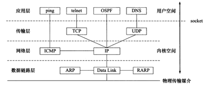- 应用层:数据链路层、网络层、传输层在内核空间中实现,应用层在用户空间实现。负责众多应用程序逻辑。应用层协议包括http,dns,telnet,ospf等协议。