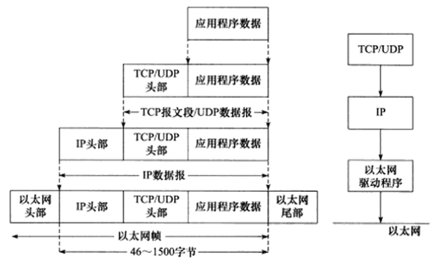 上层协议通过封装技术使用下层协议提供的服务。应用程序数据在发送到物理网络上之前,将沿着协议栈从上往下逐层封装。每层协议均在上层协议的基础上添加自己的头部(有时含尾部)信息。