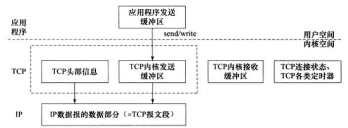 数据发送流程:发送端应用程序使用write函数向一个TCP连接写数据时,内核TCP模块首先把数据从应用程序发送缓冲区复制到与其连接对应的TCP内核发送缓冲区,然后TCP模块调用IP模块服务,将TCP报文段传送给网络层供进一步封装为IP数据报。
