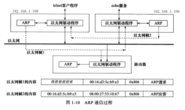 第一个数据包中,ARP通信源端物理地址是00:16:d3:5c:b9:e3,目的端物理地址是ff:ff:ff:ff:ff:ff,为以太网广播地址,表示整个局域网。该局域网上所有的机器都会收到并处理这样的帧。数值0x0806是以太网帧头部的类型字段的值,表示分用的目标是ARP模块。该以太网帧长度为42字节(实际上是46字节,tcpdump为统计以太网帧尾部4个字节的CRC字段),其中数据部分长度为28字节。“Request”表示这是一个ARP请求,“who-has 192.168.1.109 tell 192.168.1.108”则表示108机器要查询的109机器的IP地址。