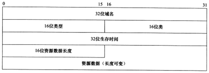 应答字段、授权字段和额外信息字段都使用资源记录(Resource Record,RR)格式。资源记录格式如下图: