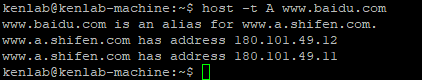 host命令输出显示,机器名www.baidu.com是www.a.shifen.com的别名。且该机器名对应两个IP地址。host命令使用DNS协议和DNS服务器通信,其-t选项表示DNS协议使用哪种各类型查询。此处使用A类型,即通过机器的域名获取其IP地址。