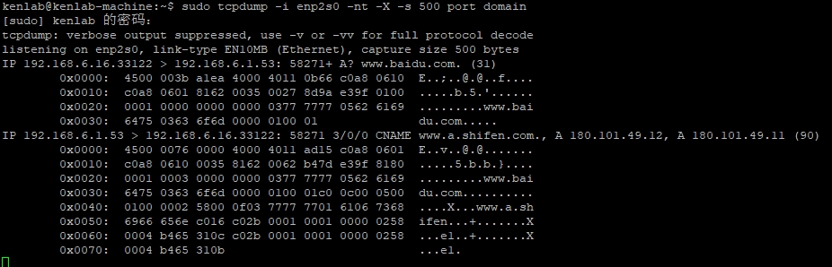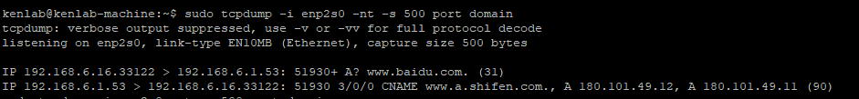 sudo tcpdump -i enp2s0 -nt -s 500 port domain host -t A www.baidu.com