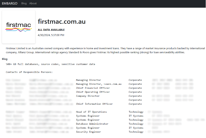 事件概述: 澳大利亚重要的金融服务公司Firstmac近日警告其客户,该公司遭受了一次数据泄露。这是在新的网络勒索团伙Embargo声称从该公司盗取了超过500GB的数据后的第二天。Firstmac主要从事抵押贷款、投资管理和证券化服务。该公司在昆士兰州布里斯班设有总部,雇佣了460名员工,发放了10万笔住房贷款,目前管理着150亿美元的抵押贷款。Firstmac在接到通知后,立即采取措施加强了系统安全。尽管如此,Firstmac仍向接收通知的客户提供了免费的身份盗窃保护服务,并建议他们对未经请求的通信保持警惕,定期检查账户对账单以寻找异常活动。 据报道,Firstmac在发现此次网络安全事件后,采取了一系列步骤来立即保护其系统。在随后的调查中,Firstmac在外部网络安全专家的协助下,确定了被泄露的信息包括全名、住址、电子邮件地址、电话号码、出生日期、外部银行账户信息和驾驶执照号码。尽管如此,Firstmac向客户保证,他们的账户和资金是安全的,公司的系统现在已经得到了适当的加强。为了加强安全性,Firstmac引入了一项新的要求,即所有的账户更改都需要使用两步验证或生物识别技术来确认用户的身份。此外,Firstmac还向接收通知的客户提供了免费的身份盗窃保护服务,并建议他们对未经请求的通信保持警惕,定期检查账户对账单以寻找异常活动。 来源: https://https://www.bleepingcomputer.com/news/security/largest-non-bank-lender-in-australia-warns-of-a-data-breach/ 政府威胁情报 事件概述:澳大利亚金融服务公司Firstmac遭受数据泄露