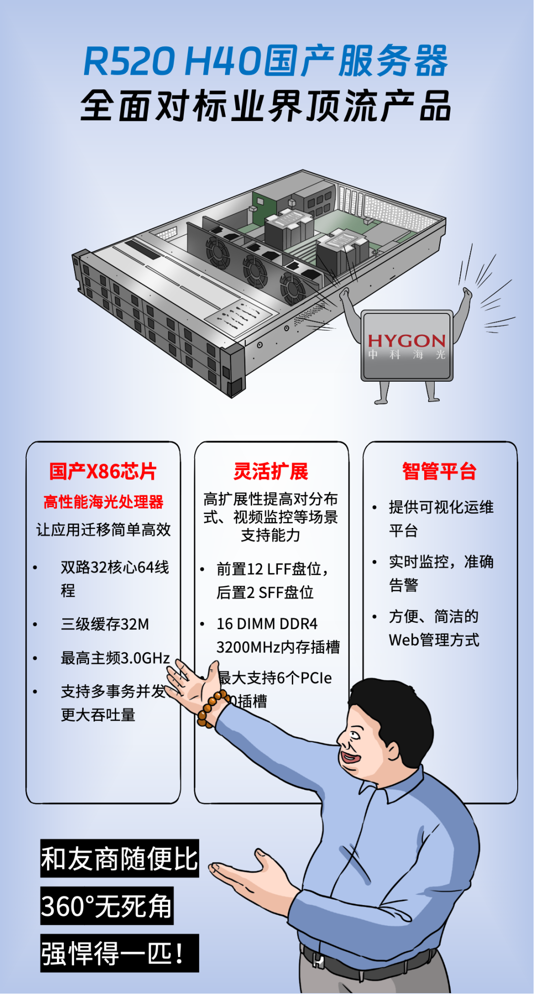 此次以旧换新计划,中科可控特推出均衡计算、轻量推理、高密存储等系列国产服务器新品,其中以R520 H40作为“焕新”主力,搭载的就是海光处理器。