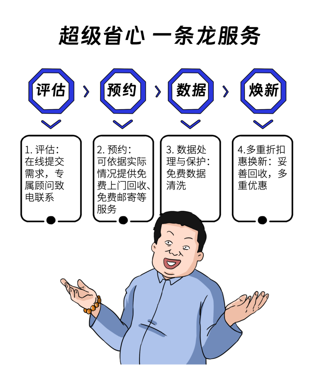 再总结一下完整流程:一站式换新,评估→预约→数据处理与保护→安装调试→数据&业务迁移→全生命周期服务