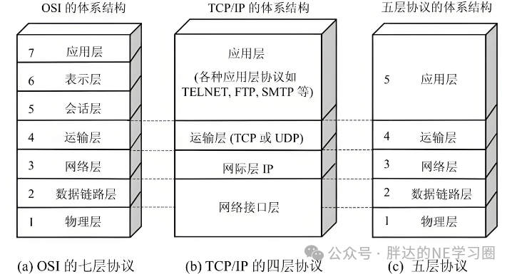 对于一名网络工程师而言,TCP/IP协议是必须学习且重点学习的内容。在计算机网络的学习中,几种网络模型也可谓是“基本功”。下图展示了三种网络模型各层间的对应关系。(a)是传统的OSI七层网络模型,(b)是TCP/IP四层模型,(c)是TCP/IP五层模型。五层模型和四层模型的唯一区别就是将网络接口层拆分成了数据链路层和物理层,五层模型是OSI七层模型和TCP/IP四层模型的折中。在本篇学习总结中,主要参考的是TCP/IP协议的五层模型。