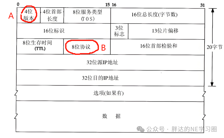 IP协议报文主要由IP首部和数据部分组成,图中展示的大部分则是IP首部内容(共20字节)。图中A圈的位置用四位二进制表示协议版本,0100表示是IPv4,0110表示是IPv6(但是IPv6的报文格式和IPv4有一点差异)。图中B圈的位置用八位二进制区分IP协议上的上层协议。例如TCP协议在IP报文中的协议号是6,即00000110,UDP协议在IP报文中的协议号是17,即00010001。