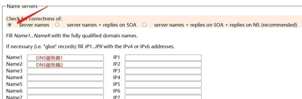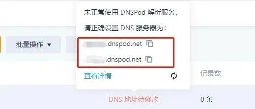 当鼠标移动到“DNS地址待修改”上面,会弹出2个DNS服务器,复制粘贴到申请域名的网页里。
