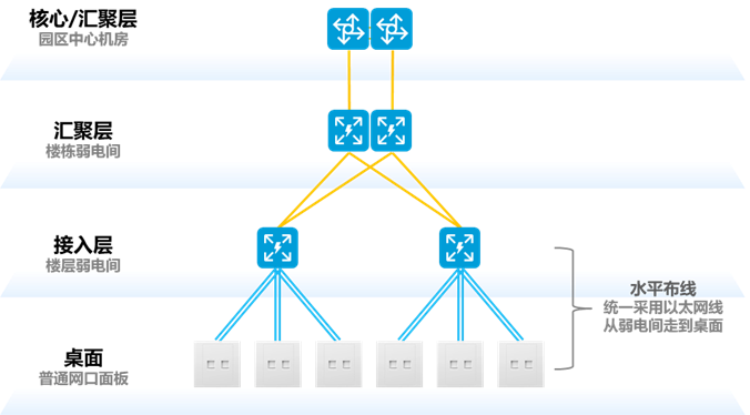 由于终端接入位置采用了标准化安装,而接入交换机通常统一放置在弱电间。因此,传统以太网在网络设计时,只需统计终端的接入点数,就能轻松计算出所需接入和汇聚交换机的数量,这种数点式的设计方式使得网络设计变得简单直观。