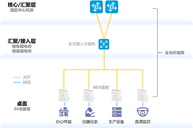 FTTD(Fiber To The Desk),光纤到桌面,使用光纤替代传统铜线,将光纤延伸至用户桌面终端,实现真正意义上的“全光”链路。基于以太的FTTD方案,以太86光面板设备(简称为86光面板)基于桌面/台面的标准86底盒安装,上行采用光纤到全光接入交换机,从而实现园区核心直达桌面的端到端全光纤组网。