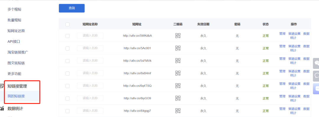 7、先往下翻,浏览器左侧工具栏里看到“短链接管理”,然后点击“我的短链接”,会弹出一个列表,如下图