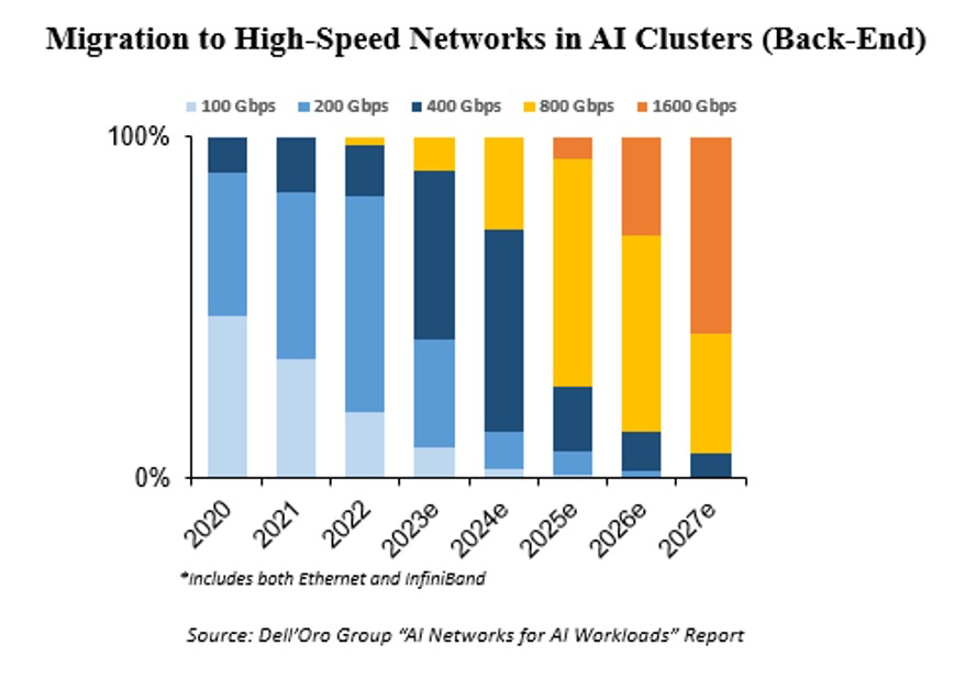 Dell’Oro Group 预测,在用于数据摄取的前端网络中,到 2027 年,三分之一的以太网端口将达到 800 Gbps 或更高。在后端网络中,运营商迫切需要提高吞吐量和降低延迟,发展速度更快。到 2027 年,几乎所有后端端口都将达到 800G 及以上,带宽将以三位数的速度增长。