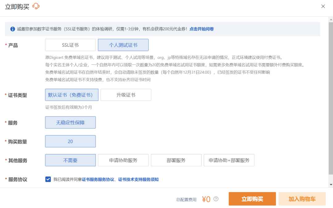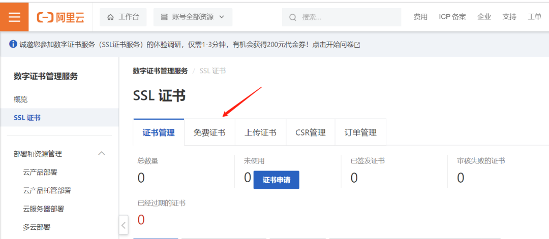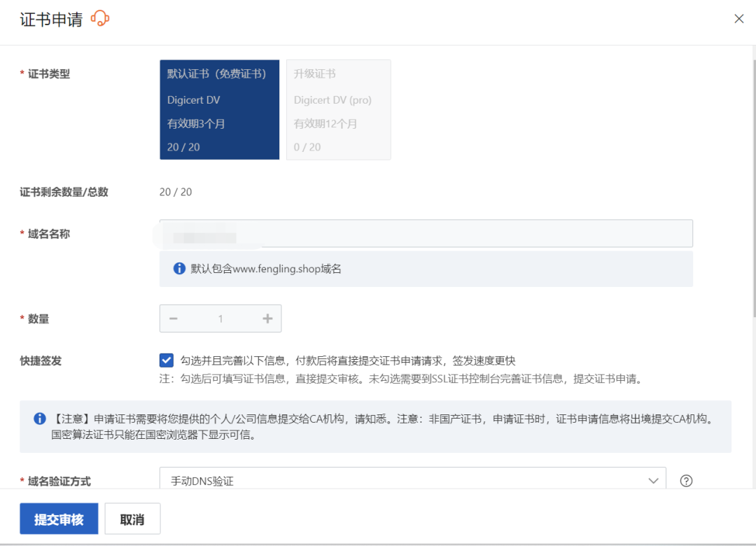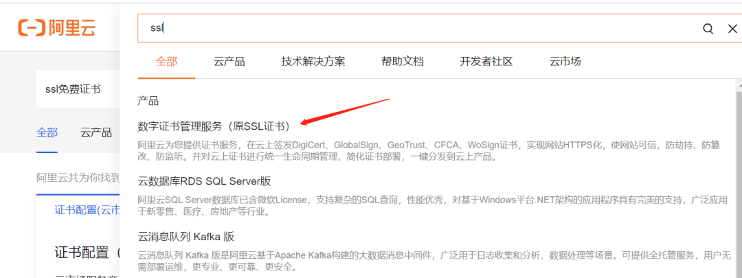 如果我们是生产环境要选用SSL证书,可以去阿里云或者其他平台选购免费的,虽然可靠性和安全性比不上那些大型的CA机构,但是个人用用是完全足够了。