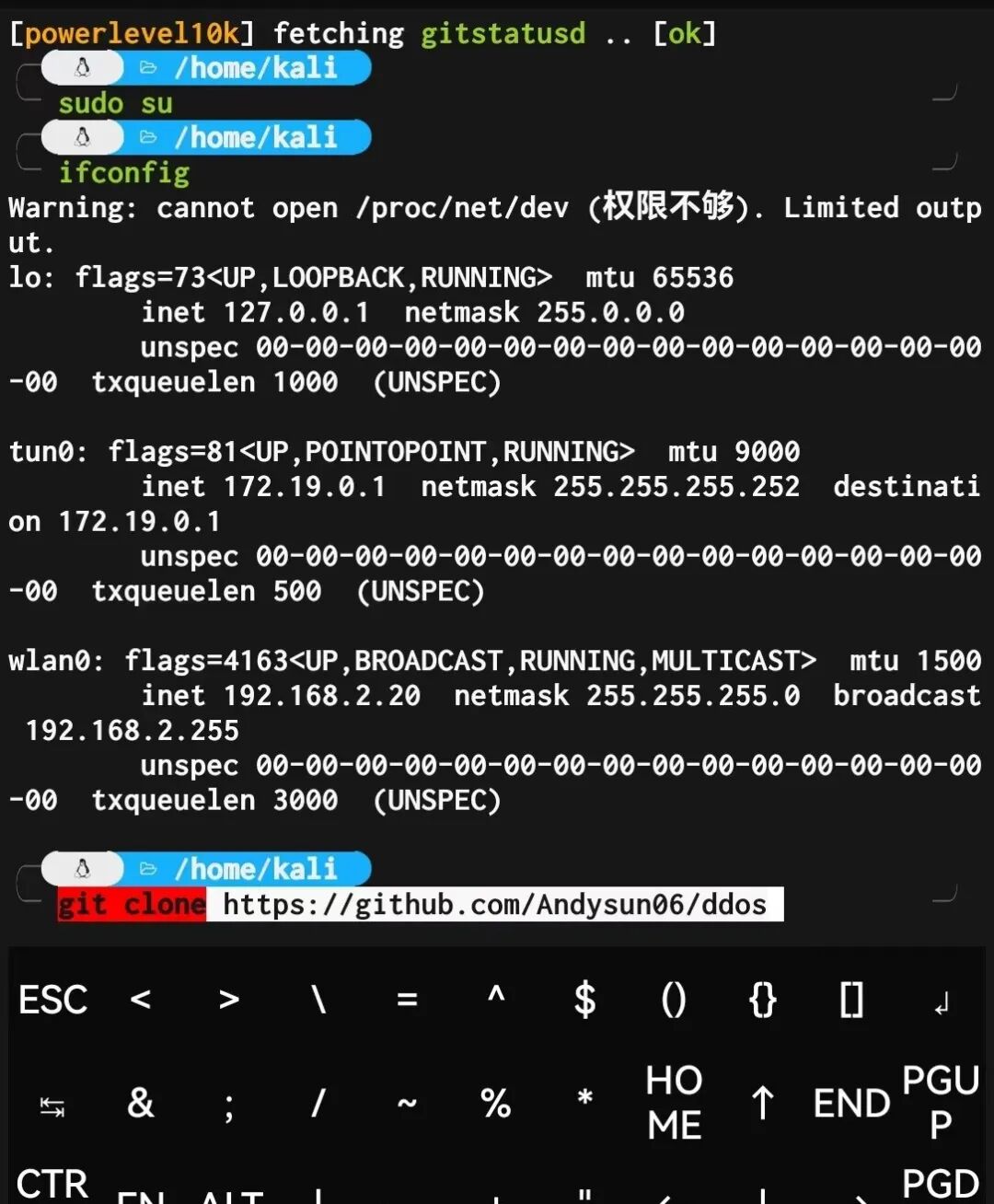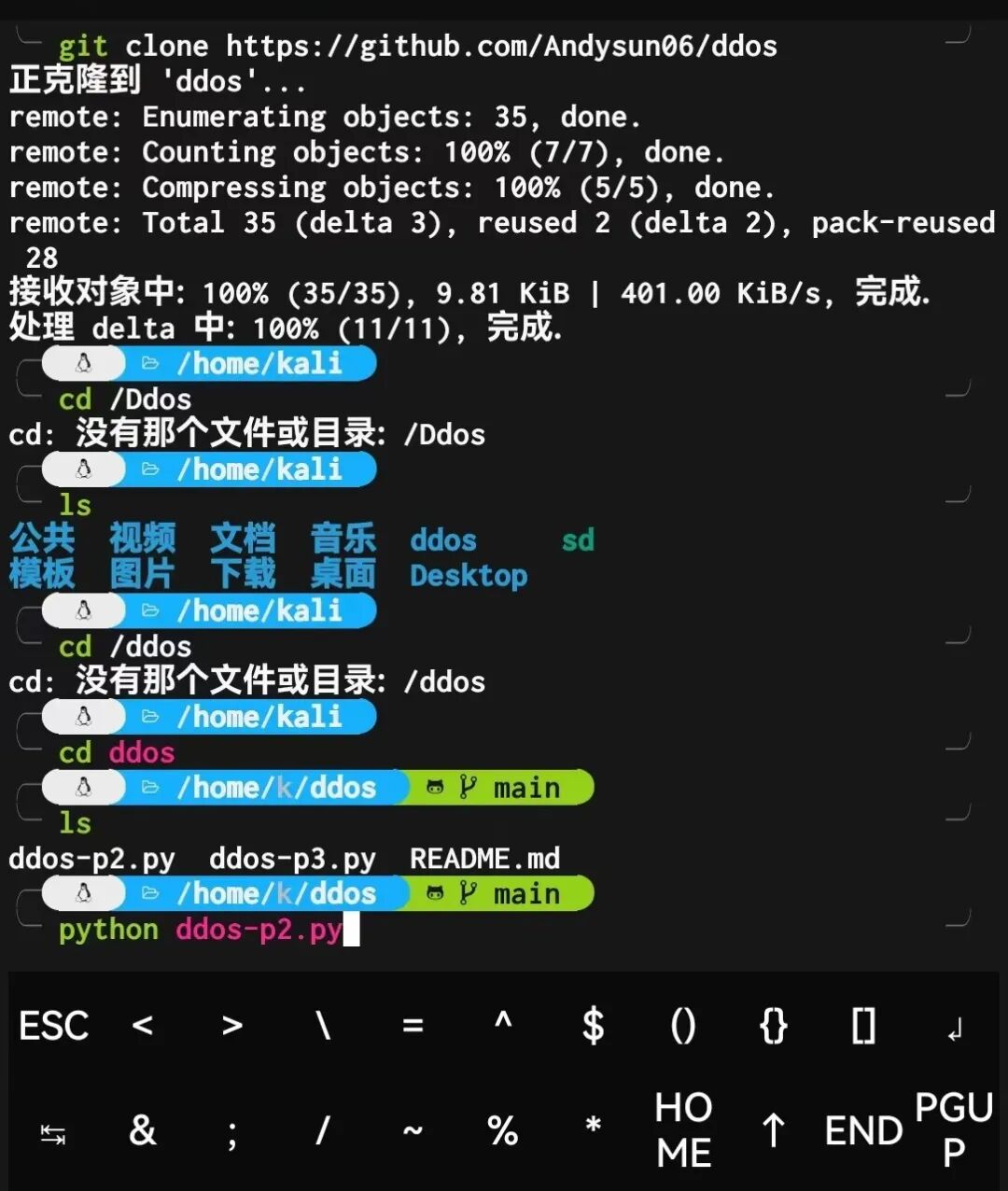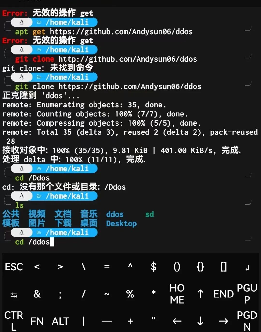首先打开你的手机kali,输入第一条命令 git clone https://github.com/Andysun06/ddos 用git clone 命令克隆一下项目文件