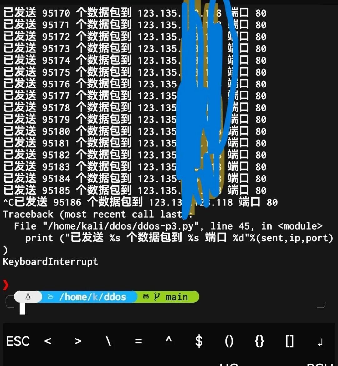 因为这个脚本是用python语言来编写的,所以我们用python来运行它 命令:python ddos-p2.py (如果这条命令报错可以换成p3)