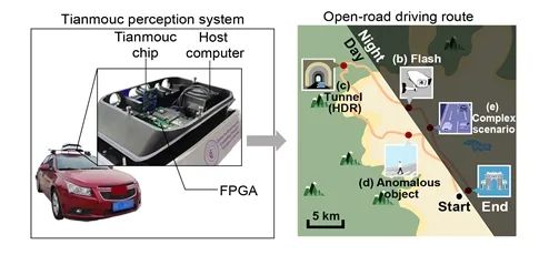 5月30日《自然》杂志封面 这一成果与我们的日常生活有哪些关系?据介绍,随着人工智能的飞速发展,无人驾驶和具身智能等无人系统在现实社会中不断推广应用,其中,视觉感知作为获取信息的关键途径,发挥着至关重要的作用。然而,在复杂多变且不可预测的环境中,实现高效、精确且鲁棒的视觉感知依然是一个艰巨的挑战。 在开放世界中,智能系统不仅要处理庞大的数据量,还需要应对各种极端事件,如驾驶中的突发危险、隧道口的剧烈光线变化、夜间强闪光干扰等。传统视觉感知芯片由于受到“功耗墙”和“带宽墙”的限制,在应对这些场景时往往面临失真、失效或高延迟的问题,严重影响系统的稳定性和安全性。 为了克服这些挑战,清华大学精密仪器系类脑计算研究团队聚焦类脑视觉感知芯片技术,提出了一种基于视觉原语的互补双通路类脑视觉感知新范式。该范式借鉴了人类视觉系统的基本原理,将开放世界的视觉信息拆解为基于视觉原语的信息表示,并通过有机组合这些原语,模仿人视觉系统的特征,形成两条优势互补、信息完备的视觉感知通路。 基于这一新范式,团队进一步研制出了世界首款类脑互补视觉芯片“天眸芯”,在极低的带宽和功耗代价下,实现了每秒10000帧的高速、10bit的高精度、130dB的高动态范围的视觉信息采集,不仅突破了传统视觉感知范式的性能瓶颈,而且能够高效应对各种极端场景,确保系统的稳定性和安全性。 类脑互补视觉感知芯片“天眸芯” 基于“天眸芯”,团队还自主研发了高性能软件和算法,并在开放环境车载平台上进行了性能验证。在多种极端场景下,该系统实现了低延迟、高性能的实时感知推理,展现了其在智能无人系统领域的巨大应用潜力。 自动驾驶感知演示平台 据悉,论文通讯作者为清华大学精密仪器系施路平教授和赵蓉教授。研究团队表示,“天眸芯”的成功研制为自动驾驶、具身智能等重要应用开辟了新的道路。结合团队在类脑计算芯片“天机芯”、类脑软件工具链和类脑机器人等方面已应用落地的技术积累,“天眸芯”的加入将进一步完善类脑智能生态,有力推动人工通用智能的发展