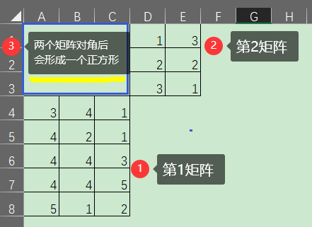 这样两个矩阵对角摆放一起后,左上角就必然形成一个正方形。