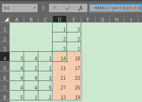 如上图所示,A4:C8是第一个矩阵,5行3列,D1:E3是第2个矩阵,3行2列。第2个矩阵的行数等于第1个矩阵的列数,都是3。
