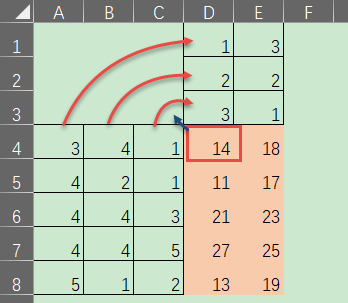 D4单元格的值等于A4:C4*D1:D3,按照数组运算规则,也就是A4*D1+B4*D2+C4*D3,结果返回14.