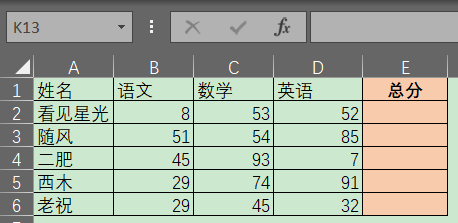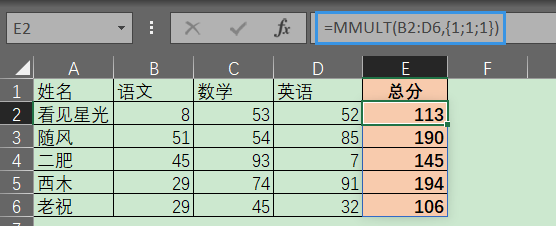 如上图所示,需要在E列统计各个学员的总分。正常而言,我们会在E2单元格输入以下公式,并向下复制填充到E2:E6区域。