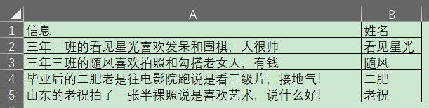 有一段数据,如下图所示,A列是信息,B列是人名。现在需要查询A列信息中同时包含三个关键字“围棋”,”二班”,”帅”的对应人名。小声说一下,正确的查询结果是”看见星光”——就怪不好意思的。