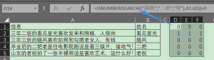 ISNUMBER(SEARCH({“围棋”,”二班”,”帅”},A1:A5))+0,这部分使用SEARCH函数查询3个关键字在A1:A5中是否存在,如果存在,返回一个序列值,否则返回错误值。然后使用ISNUMBER函数判断返回结果是否为数值,得到一个由逻辑值构成的内存数组,+0之后将逻辑值转换为数值1或0。