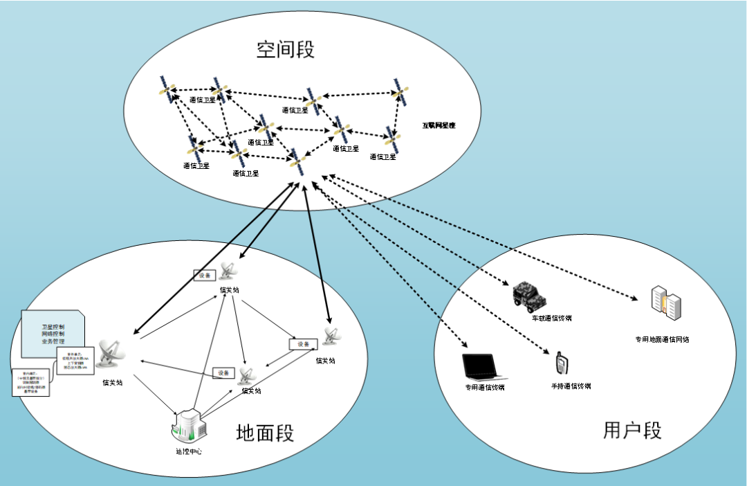 通信星座系统主要分为空间段、地面段、用户段三部分构成。
