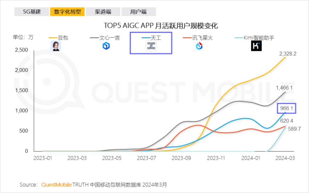 越来越多人也发现了天工AI这款产品的实力!在Quest Mobile月活榜单上天工AI处在第三位,仅次于文心一言和豆包,同花顺公告显示天工AI的日活用户(DAU)已经突破100万,可见其火爆程度远超Kimi,更是Kimi等甩出一众国产AI产品好几条街 。所不能企及的。加上,同花顺公告显示天工AI的日活用户(DAU)已经突破100万,备受用户青睐