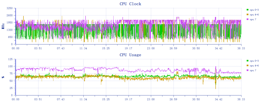 基于这个帧数逻辑,OnePlus Ace 在运行《原神》 时不需要太激进的性能调度,可以保守一些。天玑8100-MAX的四颗A78大核的频率稳定在1.7GHz左右,三颗大核的利用率约为50%-60%,一颗A78大核的利用率为86%而已。而且,一加Ace在最高分辨率《原神》下播放30分钟后,仍能保持相对较低的功耗和温度。