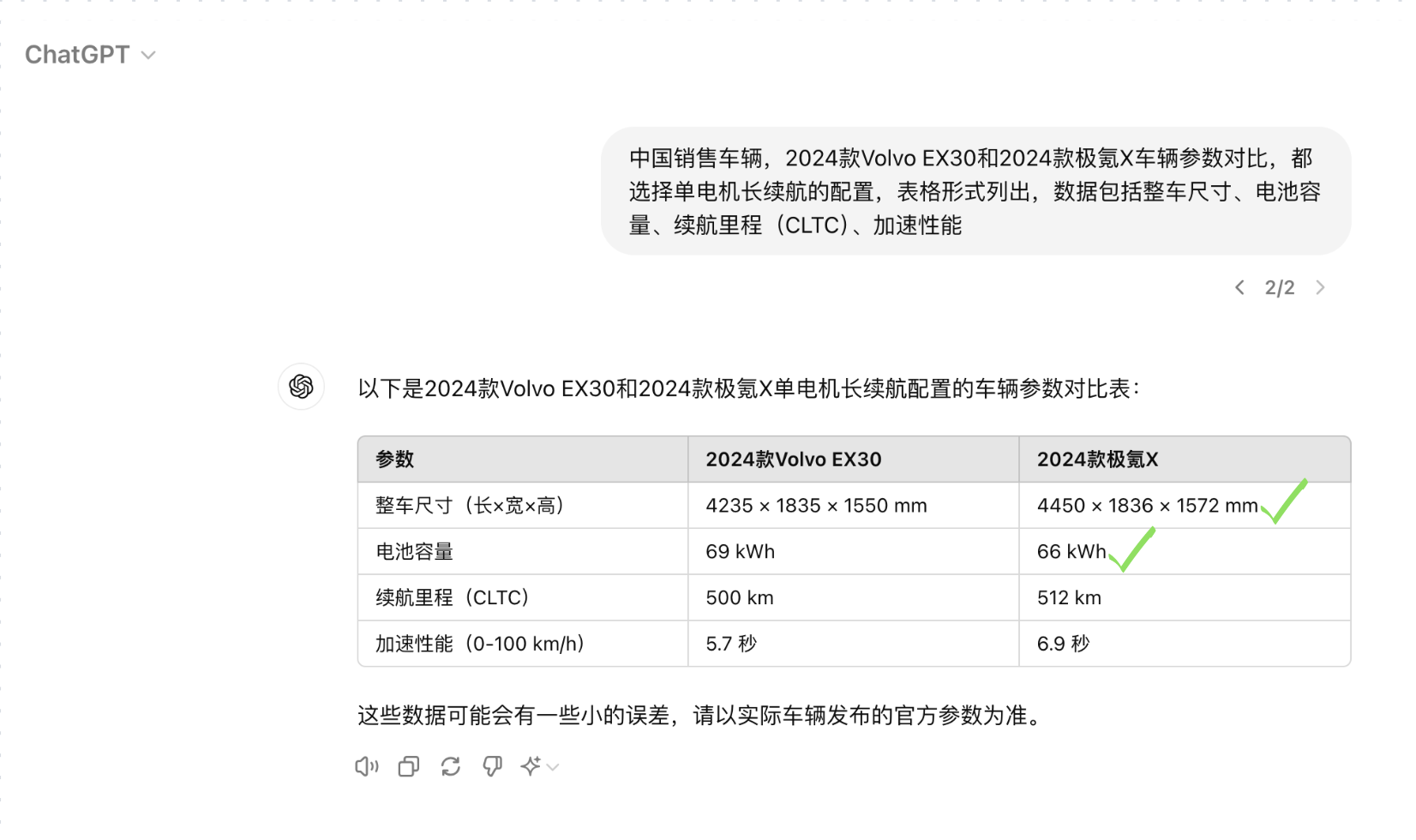 问题是:对比在华销售车辆的参数,2024款沃尔沃EX30和2024款氪星X车辆均选择单电机远程配置。数据包括车辆尺寸。电池容量、续航里程(CLTC)和加速性能。