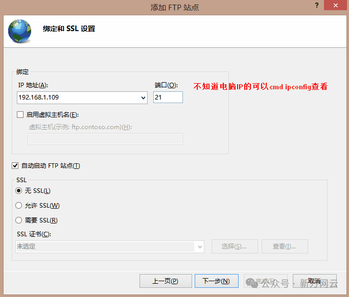 IP设置为本机的IP地址,端口用FTP默认的21,SSL勾选“无”,点击“下一步”,出现“绑定SSH设置”界面。