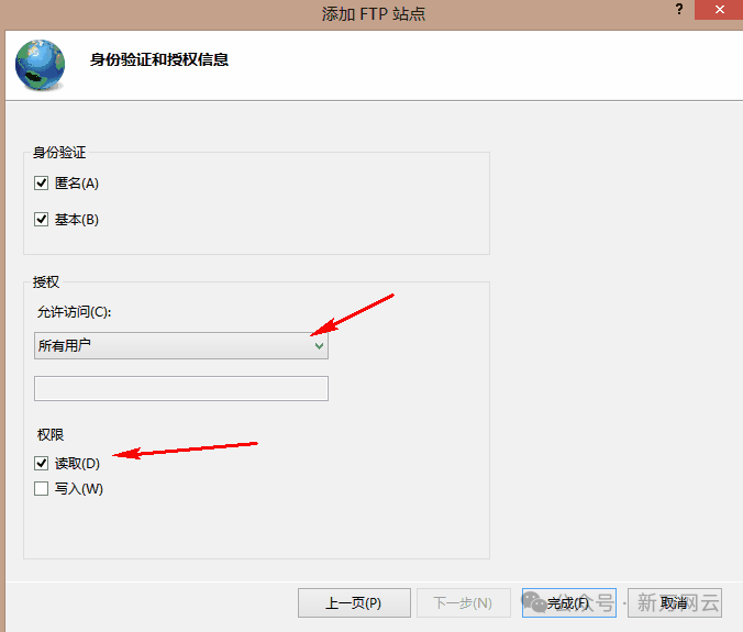 如果只是想设置简单的FTP,则“身份验证”和“授权”都勾选“匿名”,并且给匿名设置相应的权限,点击“完成”,完成FTP站点的设置。其实我也是这么设置的