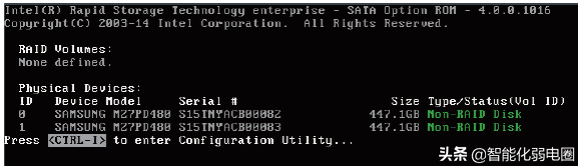 此时,按下【Ctrl】【I】即可进入SATA HostRAID配置界面。