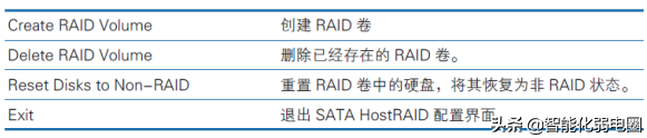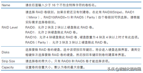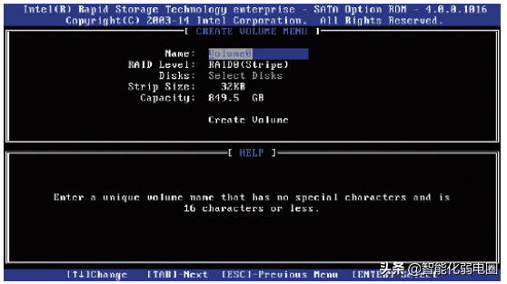 进入SATA RAID 配置界面后,使用上下方向键选择该菜单并按【Enter】键进入创建RAID 卷菜单,或者直接输入菜单前面的数字键“创建RAID 卷” ” 菜单。其他菜单的操作类似,不再赘述。创建RAID 卷的示例如下。